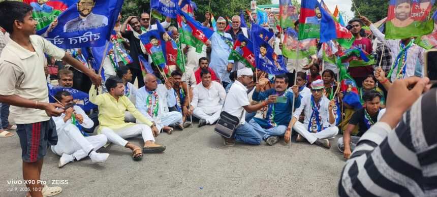 बिहार में राष्ट्रीय लोक जनशक्ति पार्टी और दलित सेना द्वारा चक्का जाम आंदोलन किया जा रहा है। जिसका उद्देश्य मतदाता सूची पुनरीक्षण के माध्यम से लोकतांत्रिक अधिकारों के हनन के खिलाफ विरोध करना है। यह आंदोलन इसलिए हो रहा है क्योंकि विपक्षी दलों का आरोप है कि चुनाव आयोग की नई प्रक्रिया पक्षपातपूर्ण, जनविरोधी और गरीबों, दलितों, महादलितों और प्रवासी मजदूरों के खिलाफ है*आंदोलन के मुख्य बिंदु:*- *मतदाता सूची पुनरीक्षण*: विपक्षी दलों का आरोप है कि चुनाव आयोग की प्रक्रिया से लाखों लोगों को वोट देने के अधिकार से वंचित किया जा सकता है.- *चक्का जाम*: राष्ट्रीय लोक जनशक्ति पार्टी और दलित सेना ने पूरे बिहार में चक्का जाम करने का आह्वान किया है.- *लोकतंत्र की रक्षा*: आंदोलनकारी लोकतंत्र की रक्षा के लिए एकजुट हो रहे हैं और सरकार से चुनाव आयोग के फैसले को वापस लेने की मांग कर रहे हैं.*विपक्ष की मांग:*- *निर्वाचन आयोग के फैसले को वापस लेना*: विपक्षी दल चाहते हैं कि सरकार चुनाव आयोग के फैसले को वापस ले।- *मतदाता सूची संशोधन*: विपक्षी दलों ने निर्वाचन आयोग से मतदाता सूची संशोधन पर नियमित रूप से अद्यतन जानकारी साझा करने का अनुरोध किया है।यह आंदोलन बिहार की राजनीति में एक बड़ा मुद्दा बनता जा रहा है, और देखना दिलचस्प होगा कि यह आंदोलन महागठबंधन को राजनीतिक मजबूती देता है या नहींमौके पर जिला अध्यक्ष विनय चौधरी, जिला मिडिया प्रभारी सह नगर अध्यक्ष उमाशंकर मिश्र,रविशंकर सिंह, चंद्रशेखर राय, राजा पासवान, रीता,पासवान, आदित्य कुमार, दीपक कुमार, दीपा कुमारी, सुनीता देवी, ममता देवी, खुशबू देवी, पिंकी देवी , बबलू पासवान , गोपाल शर्मा, सुंदर दास, राजेश कुमार, रवि कुमार, अरविंद पासवान, मनोज पासवान, संजय कुमार, जय नारायण शाह, प्रभु कुशवाहा, शत्रुघ्न पासवान, जानकी देवी, प्रमिला देवी, गुंजन कुमारी, ललिता देवी, फूलों देवी, पूनम साहनी, पप्पू कुमार, अंकित कुमार, मोहम्मद अली, मनीष कुमार, अजीत कुमार, रोशन कुमार, सुनील कुमार, डॉ विनोद सिंह, एवं राष्ट्रीय लोक जनशक्ति पार्टी एवं दलित सेना हजारों की संख्या में कार्यकर्ता उपस्थित रहे।