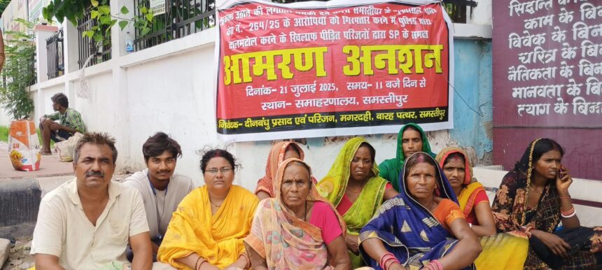 समस्तीपुर मुफस्सिल थाना कांड संख्या-264/25 के एक महीने बीतने के बाबजूद भी पुलिस-अपराधी मिलीभगत के कारण गिरफ्तार नहीं किए जाने के खिलाफ मगरदही, बारह पत्थर निवासी दीनबंधु सपरिवार द्वारा एसपी के समक्ष सोमवार से समाहरणालय पर शुरू किया गया अनिश्चितकालीन आमरण अनशन मंगलवार के दूसरे दिन अनुमंडल कक्ष में अनुमंडलाधिकारी दीलीप कुमार, अनुमंडल पुलिस उपाधीक्षक संजय कुमार पाण्डेय से पीड़ित दीनबंधु समेत भाकपा माले के सुरेंद्र प्रसाद सिंह आदि के साथ सम्मानजनक वार्ता हुई। अधिकारियों के मुकदमा का सुपरविजन कर तत्काल आरोपियों की गिरफ्तारी करने के आश्वासन के बाद आमरण अनशन समाप्त कर दिया गया।मौके पर भाकपा माले के सुरेंद्र प्रसाद सिंह ने कहा कि पुलिस के मनमानी एवं भ्रष्ट कार्यशैली के कारण पीड़ितों को न्याय से वंचित रहना पड़ता है। शहर के अंदर बाहरी हथियारबंद अपराधियों को बुलाकर तांडव करवाया गया और पुलिस मुकदर्शक बनी रही। सीसीटीवी फूटेज में पिस्तौल, राॅड, लाठी, डंडे से किया जा रहा तांडव कैद हुआ, एफआईआर हुआ लेकिन पैसा-पैरवी के कारण अपराधी गिरफ्तार नहीं हुआ। यह जदयू-भाजपा के सुशासन की सरकार पर काला धब्बा है।अनशनकारी महिला सुंदरी देवी ने कहा कि 264/25 मामले में पैसा इतना हावी रहा कि घटना के एक महीने से अधिक हो गया लेकिन एक भी अपराधी गिरफ्तार नहीं हुआ। उन्होंने कहा कि डीएसपी स्तर से केस का सुपरविजन कर घटना का सुसंगत धारा जोड़कर सभी आरोपियों को तत्काल गिरफ्तार करने, पीड़ित परिजनों को सुरक्षा देने, तोड़फोड़ में बर्बाद संपत्ति का मुआवजा देने की मांग की।पीड़ित अनशनकारी दीनबंधु प्रसाद ने बताया कि अगर हमारी मांग तत्काल पूरा नहीं किया जाता है तो 15 दिन बाद समाहरणालय परिसर में पुनः अनशन-आत्मदाह करने को मजबूर होंगे।