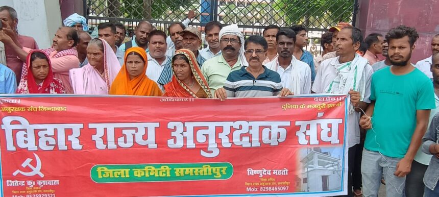 समस्तीपुर,बिहार राज्य अनुरक्षक संघ जिला कमिटी समसीपुर के अह्वान पर चीनी मिल चौक पर से जुलूस निकाल कर शहर के विभिन्न मार्ग होते हुए समस्तीपुर जिला समाहरणालय का घेराव कर सभा किया गया। इसकी अध्यक्षता जितेन्द्र कुमार कुशवाहा ने किया व संचालन विष्णुदेव महतो ने किया। सभा मे पंचायती राज विभाग से चयनित अनुरक्षक को नगर निगम समस्तीपुर में स्थानांतरण कर यथावत रखा जाए, वार्ड पार्षद के द्वारा चयनित अनुरक्षक के चाभी छीनने एवं ताला तोड़वा कर पानी टंकी को चलवाने पर रोक लगाई जाय एवं चयनित अनुरक्षक को चाभी दिलवाई जाए, नगर निगम समस्तीपुर कार्यालय से मुख्यमंत्री सात निश्चय नल जल योजना मे अनुरक्षक चयन का निकला लेटर उपलब्ध कराई जाए,नल जल योजना मे चयनित (अनुरक्षक ) पम्प ऑपरेटर, ग्रामीण, नगर निकायों, पी.एच.ई. डी.विभाग को बकाया मानदेय का भुगतान कराई जाय । नल जल योजना मे चयनीत (अनुरक्षक) पम्प ऑपरेटर ग्रामीण, नगर निकायों, पी.एच.ई. डी.विभाग को नियमीत कराई जाय। नल जल योजना मे चयनीत (अनुरक्षक ) पम्प ऑपरेटर को व्यक्तिगत (स्वय )के बैंक खाता पर भुगतान कराई जाए। नल जल योजना मे चयनित (अनुरक्षक) पम्प ऑपरेटर ग्रामीण, नगर निकायों, पी.एच.डी.विभाग को सरकारी कर्मचारी का दर्जा दिया जाय। ग्रामीण क्षेत्र नगर निकायों, पी.एच.ई. डी.विभाग मे ठीका प्रथा समाप्त किया जाए आदि मांग कि गई। सभा को संबोधित करते हुए भाकपा माले जिला स्थाई समिति के सदस्य सुरेन्द्र प्रसाद सिंह ने कहा कि सरकार नौकरी देने के बजाय नौकरी छीन रही है बड़ी संख्या मे यूवाओ को नौकरी से बिना कारण बताए बर्खास्त किया जा रहा है और उनकी बाते सुनने के बजाय सरकार दमन कर रही है, सरकार और जिला प्रशासन को चाहिए कि अनुरक्षक की बातो को सुने और उनके समस्याओं को समाधान करे । सभा को संबोधित करते हुए जितेन्द्र कुमार कुशवाहा ने कहा कि बिहार के नौजवानों मे गहरा असंतोष है बड़ी संख्या मे नौजवानों को नौकरी से निकाला जा रहा है और उनकी बातो को सुनने के बजाय सरकार दमन पर उतारू है जिसका जीता जगता उदाहरण पटना मे विभिन्न क्षेत्र के शिक्षक, एक सौ बारह के सिपाही, जल मित्र, नल जल अनुरक्षक को समस्या को नही सुनना। सभा को अशोक झा, राजा बाबू, रामप्रसाद महतो, दिलीप कुमार कुंवर, अजय कुमार पासवान, मुकेश कुमार महतो, अंजय सिंह, बिजली राम, मोहम्मद सबीर, शंकर पासवान राजेश्वर प्रसाद सिंह, नरेन्द्र कुमार नागमणि, सुमन कुमार विनोद कुमार, मनोज दास, मोहम्मद कलाम, जयप्रकाश सोनू, दीपक ठाकुर, रामबाबू पण्डित विष्णुदेव महतो ,जितेन्द्र कुमार कुशवाहा आदि ने सम्बोधित किया।