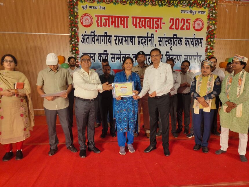 समस्तीपुर मंडल में राजभाषा पखवाड़ा – 2025 के अवसर पर ललित कला केंद्र, अधिकारी क्लब परिसर, समस्तीपुर में एक भव्य कार्यक्रम का आयोजन किया गया। इस अवसर पर एक राजभाषा प्रदर्शनी भी लगाई गई जिसमें सभी विभागों ने अपने अपने कार्यालय में राजभाषा हिंदी में किये गए कार्यों को प्रदर्शित किया। इस अवसर पर सांस्कृतिक कार्यक्रम भी प्रस्तुत किये गए।इस दौरान एक हास्य कवि सम्मेलन भी आयोजित किया गया जिसमें सभी आमंत्रित कवियों ने उपस्थित दर्शकों का काफी मनोरंजन किया।कार्यक्रम के अंत में पुरस्कार वितरण समारोह का सफलतापूर्वक आयोजन किया गया जिसमें राजभाषा पर आधारित सभी प्रतियोगिताओं तथा राजभाषा प्रदर्शनी के विजेताओं को मरेप्र द्वारा सम्मानित किया गया।इस कार्यक्रम के मुख्य अतिथि मंडल रेल प्रबंधक श्री ज्योति प्रकाश मिश्रा तथा विशिष्ट अतिथि अपर मंडल रेल प्रबंधक श्री आलोक कुमार झा थे।कार्यक्रम वरीय मंडल वित्त प्रबंधक सह उप मुख्य राजभाषा अधिकारी श्री गणनाथ झा की अध्यक्षता में हुआ।कार्यक्रम का शुभारंभ अपराह्न राजभाषा प्रदर्शनी के अवलोकन से हुआ। तत्पश्चात राष्ट्रगान के साथ औपचारिक कार्यक्रम प्रारंभ हुआ। इसके बाद मंडल रेल प्रबंधक द्वारा दीप प्रज्वलन कर पुरस्कार वितरण समारोह का शुभारंभ किया गया। इस अवसर पर राजभाषा के प्रचार-प्रसार और हिंदी के प्रयोग को बढ़ावा देने हेतु उत्कृष्ट योगदान देने वाले अधिकारियों एवं कर्मचारियों को सम्मानित किया गया।सांस्कृतिक प्रस्तुतियों के उपरांत आयोजित हास्य कवि सम्मेलन में आमंत्रित कवियों–श्री नसीम अख्तर एवं श्री आमिर हमजा ने अपनी रचनाओं से दर्शकों को खूब गुदगुदाया और कार्यक्रम को जीवंत बना दिया।समापन सत्र में मंडल रेल प्रबंधक श्री ज्योति प्रकाश मिश्रा ने अपने उद्बोधन में राजभाषा हिंदी के महत्व पर बल देते हुए कहा कि राजभाषा के अधिकतम प्रयोग से न केवल प्रशासनिक कार्य सरल होंगे बल्कि सांस्कृतिक एकता भी सुदृढ़ होगी। उन्होंने यह भी कहा कि समस्तीपुर समूह ‘क’ के अंतर्गत आता है जिससे हमारी हिंदी में कार्य करने की जिम्मेवारी और बढ़ जाती है। हम न सिर्फ हिंदी में ज्यादा से ज्यादा कार्य करे बल्कि व्याकरण दोषों से रहित कार्य करें , हमारी यही कोशिश होनी चाहिए।उल्लेखनीय है कि कार्यक्रम का शुभारंभ राष्ट्रगान के साथ हुआ तथा इसका समापन धन्यवाद ज्ञापन से हुआ।