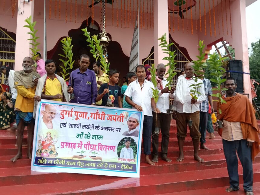 छातापुर प्रखंड के प्रसिद्ध दूर्गा मंदिर डहरिया में पर्यावरण सांसद सह ट्रीमेन रामप्रकाश रवि द्वारा नवरात्रि के अंतिम दिन माता रानी के प्रसाद के रूप में फलदार पौधे का वितरण किया गया। ट्रीमेन रवि ने बताया कि आज 2 अक्टूबर ,भारत के दो महान पुरुषो महात्मा गांधी एवं लाल बहादुर शास्त्री के जयंती के साथ साथ उनके पुत्र मयंक का भी जन्मदिन है। सदैव ख़ुशी अथवा गम के अवसर पर पौधा लगाने की परंपरा को आगे बढ़ाते हुए उनके द्वारा मां के नाम एक पेड़ प्रसाद स्वरूप वितरण किया गया। प्रसाद में पौधा देने के साथ ही सभी श्रद्धालुओं को पौधा लगाने और उसको बचाने का जानकारी दिया गया । उपस्थित सभी श्रद्धालुओं ने अधिक से अधिक पेड़ लगाने, पेड़ बचाने, प्लास्टिक के जगह कपड़े थैलै उपयोग करने ,जल बचाने एवं अपने आस पड़ोस को स्वच्छ रखने का संकल्प लिया। पहली बार प्रसाद में पौधा पाकर सभी श्रद्धालु ख़ुशी से झूम उठे। मौके पर समाजसेवी मोनू यादव,सुनिल कुमार, समिति सुबोध सरदार, लक्ष्मण साह, सुधीर पासवान, गौरव कुमार,संजीव हजारी सहित अन्य श्रद्धालु उपस्थित रहे।