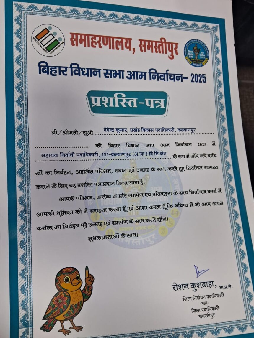 बिहार विधानसभा निर्वाचन 2025 में बेहतर कार्य करने के लिए देवेंद्र कुमार प्रखंड विकास पदाधिकारी कल्याणपुर को शनिवार के दिन जिला पदाधिकारी रोशन कुशवाहा ने डॉ राजेंद्र प्रसाद केंद्रीय कृषि विश्वविद्यालय पूसा के विद्यापति सभागार में प्रशस्ति पत्र से सम्मानित किया गया। निर्वाचन कार्य में भूमिका निभाने वाले प्रखंड स्तरीय सभी पदाधिकारी एकेडमी पंचायत स्तरीय सभी कर्मी जिनकी मेहनत के कारण यह शांतिपूर्वक संपन्न कराने में सफल रहा उन सभी को विशेष रूप से प्रखंड विकास पदाधिकारी हर्ष जताया साथी पत्रकार बंधु को भी विशेष रूप से धन्यवाद जिनका सहयोग काफी सकारात्मक रहा।