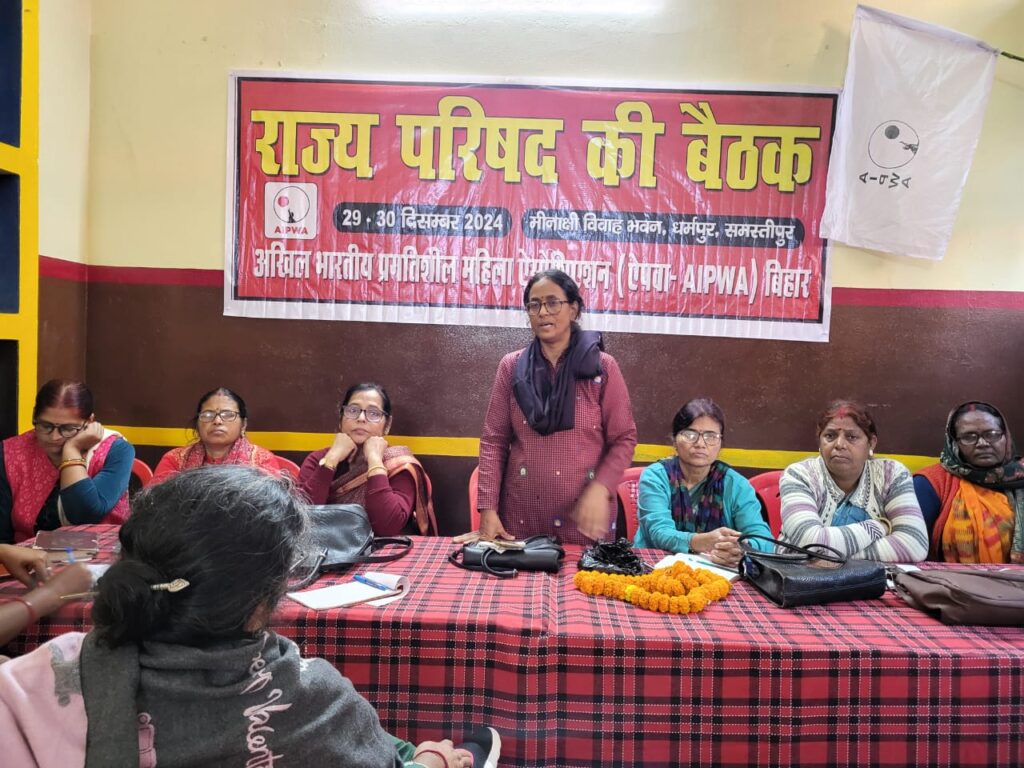 इस देश में हिंदू कोड बिल लाने वाले अंबेडकर थे जिससे महिलाओं को संपत्ति का अधिकार, हिंदू धर्म में बहु-विवाह के खिलाफ महिला का बात करना, महिलाओं को वोट देने का अधिकार, तालाक हासिल करने का अधिकार आदि के लिए अंबेडकर हमेशा प्रयासरत थे। उन्होंने कहा कि आरएसएस के लोग जो हिंदू महासभा से जुड़े थे, हिंदू कोड का विरोध किए थे। आज हमें जो अधिकार मिला है वह इस संविधान की देन है, अंबेडकर की देन है और इसे बचाने के लिए इस बैठक से ऐपवा संघर्ष का निर्णय लेगी। उन्होंने कहा कि बिहार के अंदर इस कदर नफरती माहौल बनाया जा रहा है जहां गांधीजी का प्रिय भजन “रघुपति राघव राजा राम… ईश्वर अल्लाह तेरे नाम” गाने पर गायिका देवी से माफी मंगवाया जाता है। भाजपा आज देश को कहां ले जा रही है जहां अंबेडकर पर अपमानजनक टिप्पणी की जाती है, भजन गाने पर माफी मंगवाया जाता है और ये सब कर रहे हैं देश में सत्ता में बैठे दल। उन्होंने कहा कि देश में महिलाओं के अधिकारों पर जो हमले हो रहे हैं, उस पर बात कर के अधिकारों की रक्षा के लिए आंदोलन का रूपरेखा बनाया जाएगा। उन्होंने कहा कि बगल के राज्य झारखंड,महाराष्ट्र, कर्नाटक, दिल्ली आदि में महिलाओं के लिए योजना चलाया जा रहा है लेकिन बिहार में ऐसी कोई योजना नहीं है। ऐपवा मांग कर रही है कि बिहार में सभी महिलाओं को 3 हजार रुपए महीना सशक्तिकरण राशि सरकार दें। बिहार में जो भी स्वयं सहायता समूह है, ये महिलाओं के लिए कोई ठोस काम नहीं कर पा रही है। ये सिर्फ दिखावे के लिए समूह को कुछ काम मिल जा रहा है लेकिन समूह से जुड़े डेढ़ करोड़ महिलाओं को कहीं रोजगार नहीं मिल रहा है। समूह से जुड़े महिलाओं को कर्ज नहीं मिल रहा है, जरूरतमंद महिलाएं कर्ज के लिए माइक्रोफाइनेंस कंपनीयों के महंगे ब्याज के मकड़जाल में फंसते जा रहे हैं और कर्ज की बोझ में दबी महिलाएं आत्महत्या तक की घटनाएं सामने आ रही हैं।