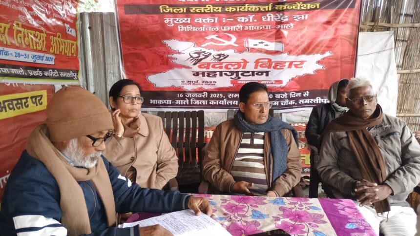 उन्होंने संघ संचालक मोहन भागवत के ब्यान पर प्रतिक्रिया व्यक्त करते हुए कहा कि भाजपा-संघ को भारत की आजादी, स्वतंत्रता सेनानियों की कुर्बानी, संविधान से कोई लेना-देना नहीं है। ये लोग मनुस्मृति को संविधान बनाने पर तुले हैं इसलिए ये हमेशा आजादी, स्वतंत्रता सेनानी, भारत का प्रतीक , राष्ट्रीयता से कोई लेना-देना नहीं है इसलिए वे हमेशा इस पर अनाप-शनाप बोलते रहते हैं। उक्त बातें भाकपा माले पोलिट ब्यूरो सदस्य सह मिथिलांचल प्रभारी धीरेंद्र झा ने गुरुवार को शहर के मालगोदाम चौक स्थित जिला कार्यालय में जिला स्तरीय बदलो बिहार महाजुटान कार्यकर्ता कन्वेंशन को बतौर मुख्य वक्ता संबोधित करते हुए कहा।कन्वेंशन की अध्यक्षता जिला सचिव उमेश कुमार ने की। कन्वेंशन को उजियारपुर सचिव गंगा प्रसाद पासवान, ताजपुर सचिव सुरेंद्र प्रसाद सिंह, कल्याणपुर सचिव दिनेश कुमार, वारिसनगर सचिव रामचंद्र पासवान, सरायरंजन सचिव राजकुमार पासवान, रोसड़ा सचिव हरिकांत झा, नगर कार्यकारी सचिव जयंत कुमार, समस्तीपुर सचिव अनील चौधरी, विभूतिपुर सचिव अजय कुमार समेत जिला स्थाई समिति सदस्य जीबछ पासवान, ललन कुमार, फूलबाबू सिंह, जिला कमिटी सदस्य आसिफ होदा, खुर्शीद खैर आदि ने कन्वेंशन को संबोधित किया।