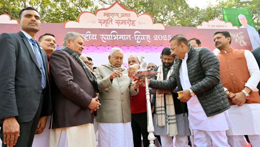 पटना 19 जनवरी 2025 :- मुख्यमंत्री श्री नीतीश कुमार विधान पार्षद श्री संजय सिंह केसरकारी आवास 22 / एम० स्ट्रैण्ड रोड पर राष्ट्रीय स्वाभिमान दिवस के अवसर पर आयोजित राष्ट्र रत्न महाराणा प्रताप स्मृति समारोह का दीप प्रज्जवलित कर शुभारंभ किया।