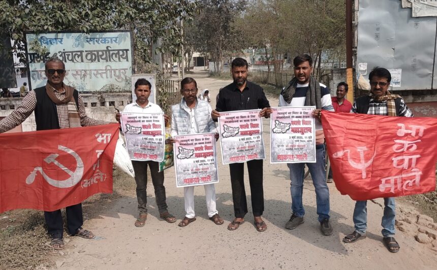 ताजपुर/समस्तीपुर भाकपा माले ने जनसंपर्क अभियान चलाकर 2 मार्च को पटना के गांधी मैदान में महाजुटान रैली में भाग लेने की अपील ताजपुर वासियों से की।शुक्रवार को भाकपा माले कार्यकर्ताओं ने प्रखंड मुख्यालय से जनसंपर्क अभियान की शुरुआत की। सभी गरीबों को 72 हजार रुपए से कम का आय प्रमाण-पत्र बनाने, आवास सूची में नाम जोड़ने, भूमिहीन को वासभूमि एवं सरकारी जमीन पर बसे को पर्चा देने, 2 सौ यूनिट बिजली फ्री देने, महिलाओं को 3 हजार रूपए देने, वृद्धावस्था, मोसमाती एवं दिव्यांग पेंशन की राशि 3 हजार रूपए करने, प्रति यूनिट 15 किलो राशन देने, स्कीम वर्कर्स को राज्य कर्मी का दर्जा देने आदि मांगों से संबंधित नारे लगाते हुए जुलूस बाजार क्षेत्र का भ्रमण कर राजधानी चौक पर सभा में तब्दील हो गया। सभा की अध्यक्षता प्रखंड सचिव सुरेंद्र प्रसाद सिंह ने की। उन्होंने उपस्थित लोगों को संबोधित करते हुए कहा कि ताजपुर समेत मानवता को शर्मशार करने वाली घटना थूककांड के आरोपी बीडीओ गौरव कुमार पर जिलाधिकारी एवं सरकारी पूर्व समझौतानुसार कारवाई करे अन्यथा आंदोलन तेज किया जाएगा। माले नेता ने ताजपुर के तमाम राजनीतिक दलों, संगठनों एवं जनप्रतिनिधियों से थूककांड के लिए न्याय की मांग को लेकर संघर्ष का रूख अख्तियार करने की अपील की। मौके पर नौशाद तौहीदी, मो० एजाज, मो० क्यूम, प्रभात रंजन गुप्ता, ब्रह्मदेव प्रसाद सिंह, संजीव राय, रवींद्र राय, मुकेश कुमार गुप्ता आदि मौजूद थे।