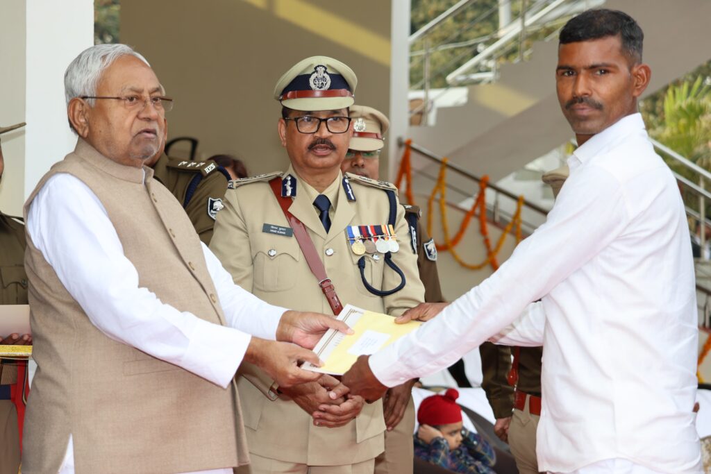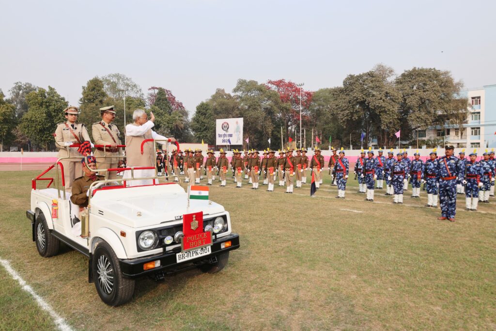 पटना:- मुख्यमंत्री श्री नीतीश कुमार आज बिहार विशेष सशस्त्र पुलिस-5 परिसर स्थित मिथिलेश स्टेडियम में आयोजित बिहार पुलिस सप्ताह-2025 के समापन समारोह में शामिल हुए।कार्यक्रम की शुरुआत में मुख्यमंत्री ने परेड का निरीक्षण किया और सलामी ली।