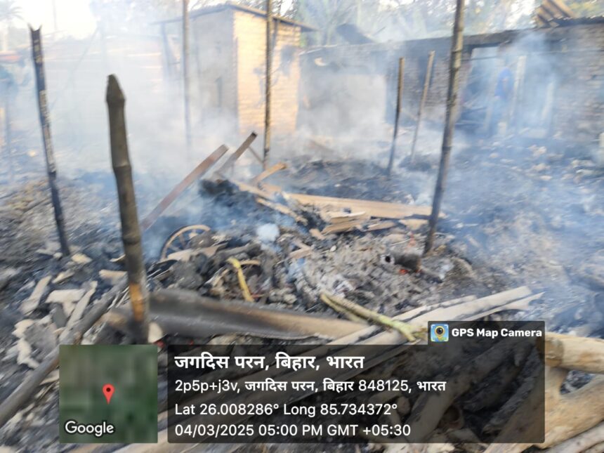 कल्याणपुर प्रखंड के चकमेहसी थाना क्षेत्र के सोरमार पंचायत अंतर्गत जगदीश पारण गांव में खाना बनाने के क्रम में आग लगने से पांच घर पूर्ण रूपेण जल के राख हो गए। वहीं दूसरी ओर चार घर आंशिक जले। इस संबंध में मुखिया पति डॉ पंकज सहनी ने बताया कि मंगलवार की शाम अचानक खाना बनाने के क्रम में आग लगी घर में रखे सारे सामान जलकर राख हो गए। ग्रामीणों के सहयोग से आग पर काबू पाया गया। अग्नि पीड़ित में स्वर्गीय केश्वर दास के पुत्र माधो दास, रंजन दास की पत्नी पिंकी देवी माधो दास के पुत्र टुनटुन दास, स्वर्गीय गूगल दास के पुत्र संदीप कुमार दास स्वर्गीय माधो दास के पुत्र मखन कुमार शामिल है,वही आंशिक रूप से घर जलने वालों की पहचान मक्खनकुमार ,मिथिलेश सहनी, पंकज सहनी, विकास सहनी का घर आंशिक रूप से जला है। अंचल पदाधिकारी शशि रंजन ने बताया कि आग लगने की सूचना पर हल्का कर्मचारी को जायजा के लिए भेजा गया है। प्रतिवेदन आने के बाद आपदा से मिलने वाली राशि का चेक प्रदान किया जाएगा। अंचल कार्यालय से पन्नी भेजी गई है। मुखिया की ओर से राहत सामग्री खाने पीने की देने की बात बताई गई है।