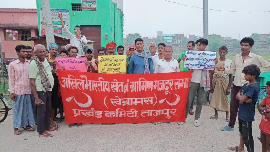 ताजपुर/समस्तीपुर किसान-मजदूर विरोधी केंद्र सरकार के खिलाफ संयुक्त श्रमिक संगठन, संयुक्त किसान मोर्चा, संयुक्त खेत मजदूरों सहित अन्य सेवा संगठनों के राष्ट्रव्यापी आह्वान पर 20 मई को देशव्यापी आम हड़ताल को बड़ी भागीदारी से सफल बनाने के उद्देश्य से मंगलवार को खेग्रामस एवं भाकपा माले द्वारा ताजपुर के जनता मैदान में सभा का आयोजन किया गया।सभा की अध्यक्षता खेग्रामस के प्रखंड अध्यक्ष प्रभात रंजन गुप्ता ने किया। सभा को जनक राम, प्यारेलाल दास, मनोहर कुमार, मो० क्यूम, बिन्देश्वर राय, ननकी सहनी, अनोज पासवान, सुनील महतो संबोधित किया।सभा को संबोधित करते हुए भाकपा माले प्रखंड सचिव सुरेंद्र प्रसाद सिंह ने कहा कि मोदीजी के नेतृत्व वाली एनडीए सरकार द्वारा 4 श्रम कोड को लागू करने के खिलाफ एवं देश की जनता को सभी जनहितैषी योजनाओं से कटौती कर आम जनता को धार्मिक भावनाओं में भटका कर मूल समस्याओं से दिशाविहीन कर रही है। देश के संविधान, लोकतंत्र, भाईचारा, एकता, एवं अखंडता की रक्षा के लिए अपने-अपने क्षेत्र में, संबंधित विभाग एवं कल-कारखानों में आम हड़ताल को सफल बनाएं।अपने अध्यक्षीय संबोधन में खेग्रामस के प्रखंड सचिव प्रभात रंजन गुप्ता ने मजदूर विरोधी 4 श्रम कोड को समाप्त करने, फसलों पर एमएसपी देने, मनरेगा में 2 सौ दिन काम एवं 6 सौ रुपए मजदूरी देने,सभी रिक्त पदों पर बहाली करने, ओटीएस लागू करने, स्कीम वर्करों को चतुर्थ वर्गीय कर्मचारी का दर्जा देने, बृद्धा- दिव्यांग- मोसमाती पेंशन 3 हजार रूपये देने, किसानों का कर्ज माफ करने, बिहार में बंद बाजार समिति को पुनः चालू करने, भूमिहीनों को 5-5 डीसमल जमीन देने, भूमिसर्वे हेतु पंचायत में शिविर लगाकर भू-अभिलेख उपलब्ध कराने, आंधी-तुफान-ओलावृष्टि में फसल क्षति मुआवजा देने जैसे जनहितैषी मांगों को लेकर आम हड़ताल का आह्वान किया गया है।अखिल भारतीय किसान महासभा के प्रखंड अध्यक्ष ब्रह्मदेव प्रसाद सिंह ने उपस्थित लोगों से बड़ी भागीदारी के साथ आम हड़ताल को सफल बनाने की अपील की।