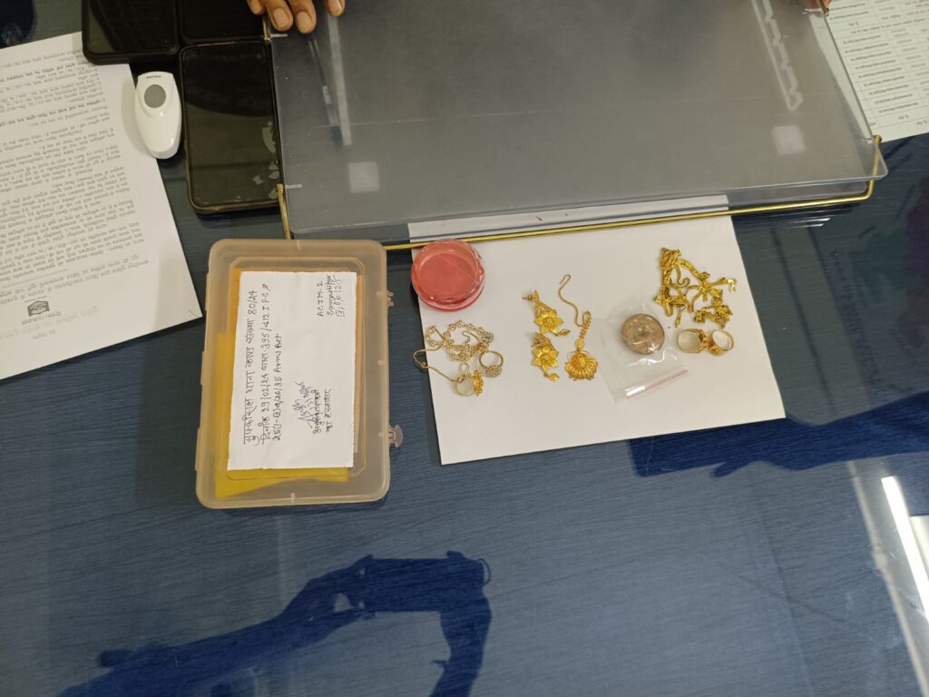 जिसमें आधा दर्जन से अधिक हथियारबंद अपराधियों ने ज्वेलरी शोरूम में घुसकर स्टाफ, गार्ड और ग्राहकों को बंधक बना कर डायमंड, सोना, चांदी और नकदी लूटकर बदमाश फरार हो गए थे। उन्होंने बताया कि इस मामले में मुफ्फसिल थाना में केस दर्ज किया गया था। इस लूटकांड में कुल 15 अपराधी शामिल थे। इनमें से 13 पहले ही गिरफ्तार हो चुके हैं, एक की मौत हो चुकी है और एक अपराधी राजा साह फरार है। फरार अपराधियों की तलाश में एसटीएफ और पुलिस की टीम लगातार दबिश दे रही थी।एएसपी ने बताया कि गिरफ्तार अपराधियों की पहचान सारण जिले के मुफ्फसिल थाना क्षेत्र के तुर्कवलिया वाजिदपुर के सुरेश राय के पुत्र अभिषेक राय उर्फ बच्चा राय और उसी थाना क्षेत्र के नैनी पश्चिमी टोला के स्व. उमाशंकर राय के पुत्र विशाल कुमार उर्फ गोविंदा के रूप में हुई है। दोनों को उनके घर से गिरफ्तार किया गया है। पूछताछ में दोनों ने लूट की बात स्वीकार की है। साथ ही दोनों वारदात के दिन दुकान के अंदर घुसे थे, जिसकी पुष्टि सीसीटीवी से भी हुई है। दोनों गिरफ्तार अपराधी पुराने आपराधिक मामलों में भी शामिल रहे हैं। सारण जिले के कई थानों में लूट और शस्त्र अधिनियम के तहत मामले दर्ज हैं।उन्होंने बताया कि गिरफ्तार अपराधी अभिषेक राय उर्फ बच्चा राय के पास से सोना जैसा धातु का 9.35 ग्राम का लेडीज रिंग दो पीस, 9.55 ग्राम का लेडीज चेन बरामद हुआ है। वहीं, विशाल उर्फ गोविंदा के पास से सोने जैसे धातु का 5.86 ग्राम का दो अंगूठी, 11.93 ग्राम का कान झाला 1 पीस, 6.12 ग्राम का मांग टीका 1 पीस, 18.56 ग्राम का दो चेन और गलाया हुआ 103.8 ग्राम सोना बरामद किया गया है।इस छापेमारी दल में मुफ्फसिल थानाध्यक्ष अजित प्रसाद सिंह, पुअनि प्रमोद कुमार मंडल, पुअनि राहुल कुमार रजक, सिपाही आजाद कुमार, अजीत कुमार एवं चालक हवलदार वशिष्ट कुमार पाण्डेय शामिल थे।इस पुलिस टीम की सफलता पर एसपी ने एसटीएफ और स्थानीय पुलिस की टीम की सराहना की है। इस संबंध में एसपी कार्यालय के द्वारा जारी प्रेस विज्ञप्ति के अनुसार, कहा गया है कि लूटी गई बाकी ज्वेलरी की बरामदगी और फरार अपराधी की गिरफ्तारी के लिए छापेमारी जारी है। विशेष टीम के सदस्यों और एसटीएफ टीम को इनाम दिया जाएगा।